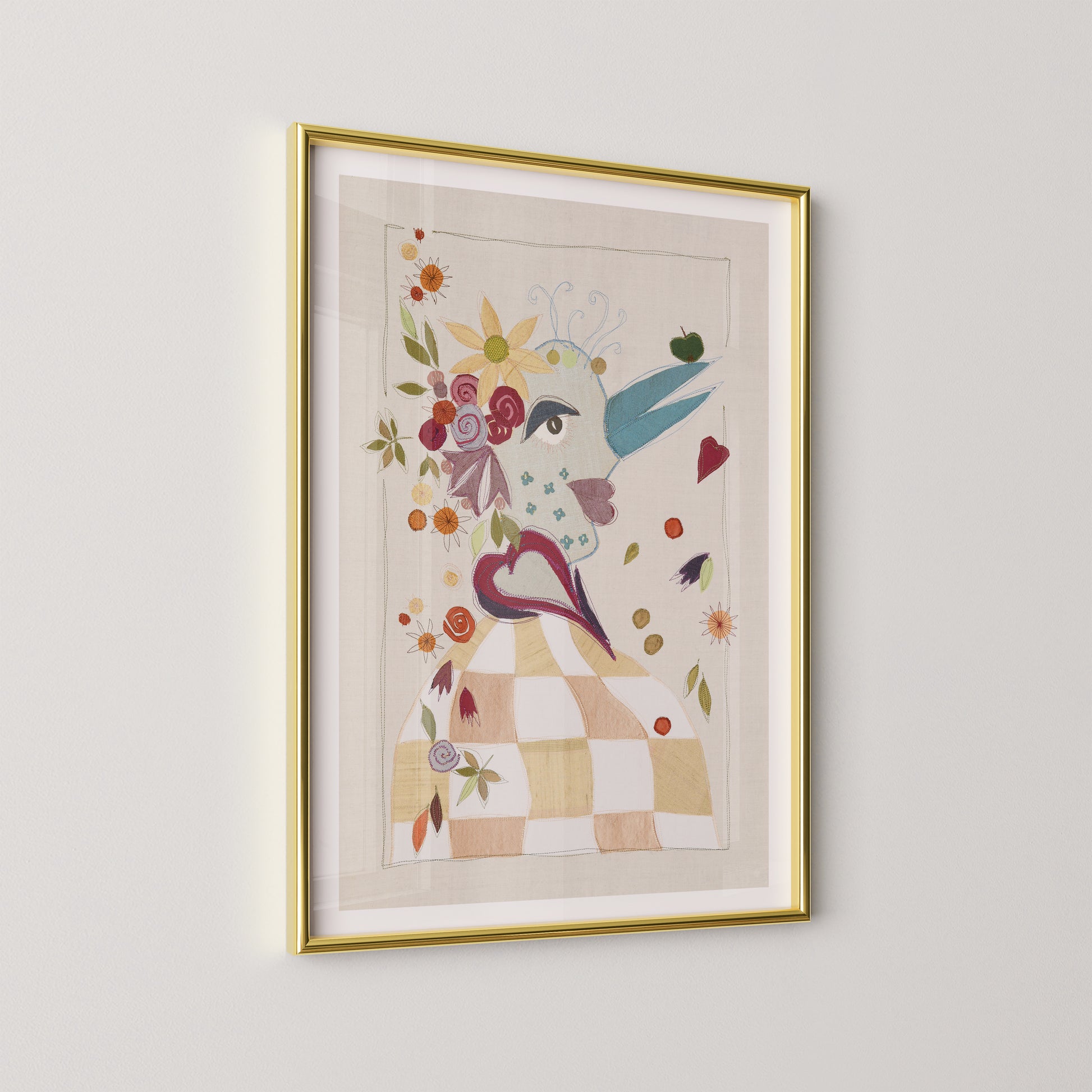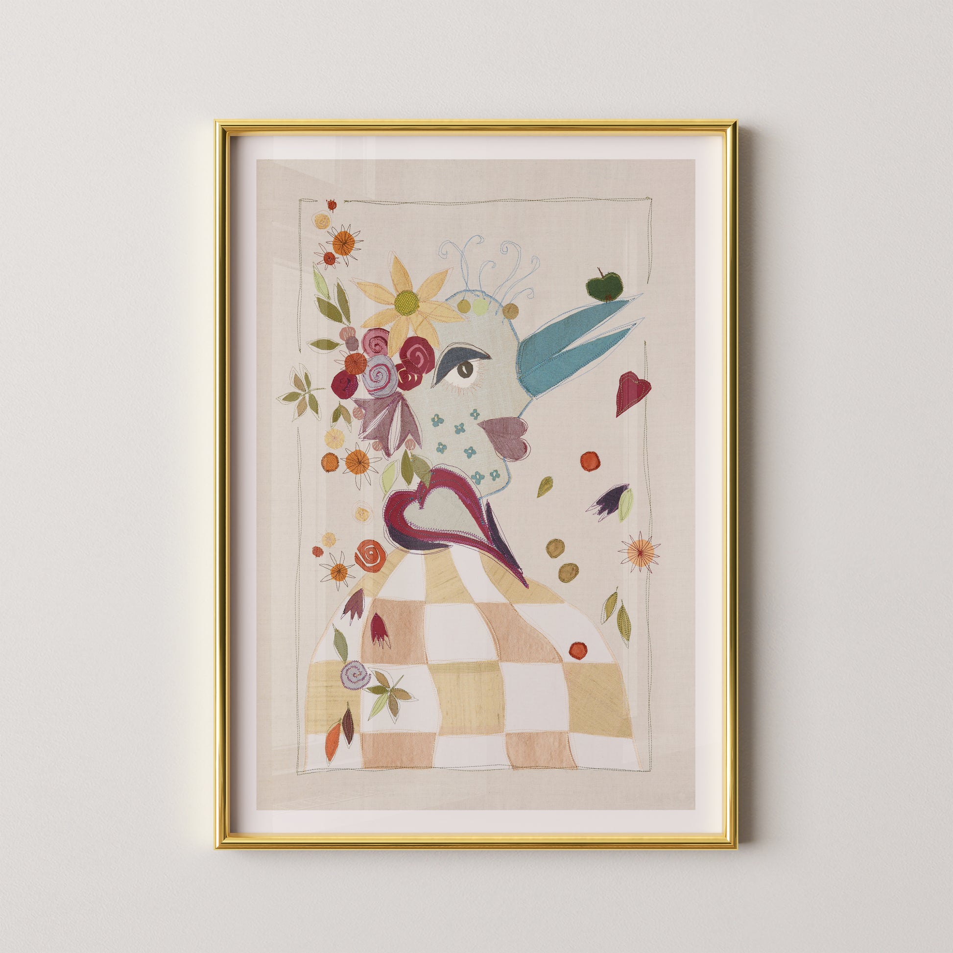 Dieser Kunstdruck basiert auf einem handgearbeiteten Stoffbild, das in aufwendiger Applikationstechnik entstanden ist (mehr dazu findest du unter "Unsere Geschichte"). Mit Hilfe eines speziellen Strukturscanners wurden die originalen Werke Digitalisiert. Durch eine hohe Auflösung bleiben selbst feine Nähte und die charakteristischen Stoffstrukturen im Druck sichtbar und die textile Tiefe des Originals bleibt auch auf Papier erfahrbar.