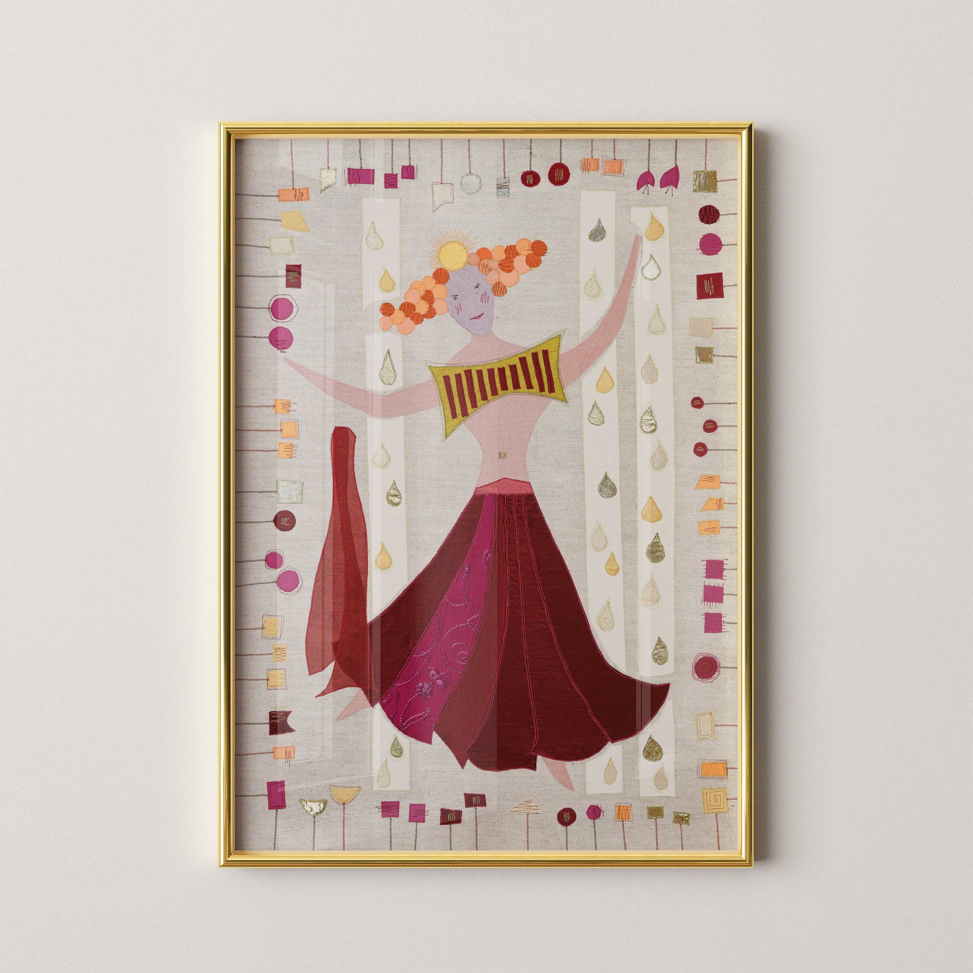 Dieser Kunstdruck basiert auf einem handgearbeiteten Stoffbild, das in aufwendiger Applikationstechnik entstanden ist (mehr dazu findest du unter "Unsere Geschichte"). Mit Hilfe eines speziellen Strukturscanners wurden die originalen Werke Digitalisiert. Durch eine hohe Auflösung bleiben selbst feine Nähte und die charakteristischen Stoffstrukturen im Druck sichtbar und die textile Tiefe des Originals bleibt auch auf Papier erfahrbar.