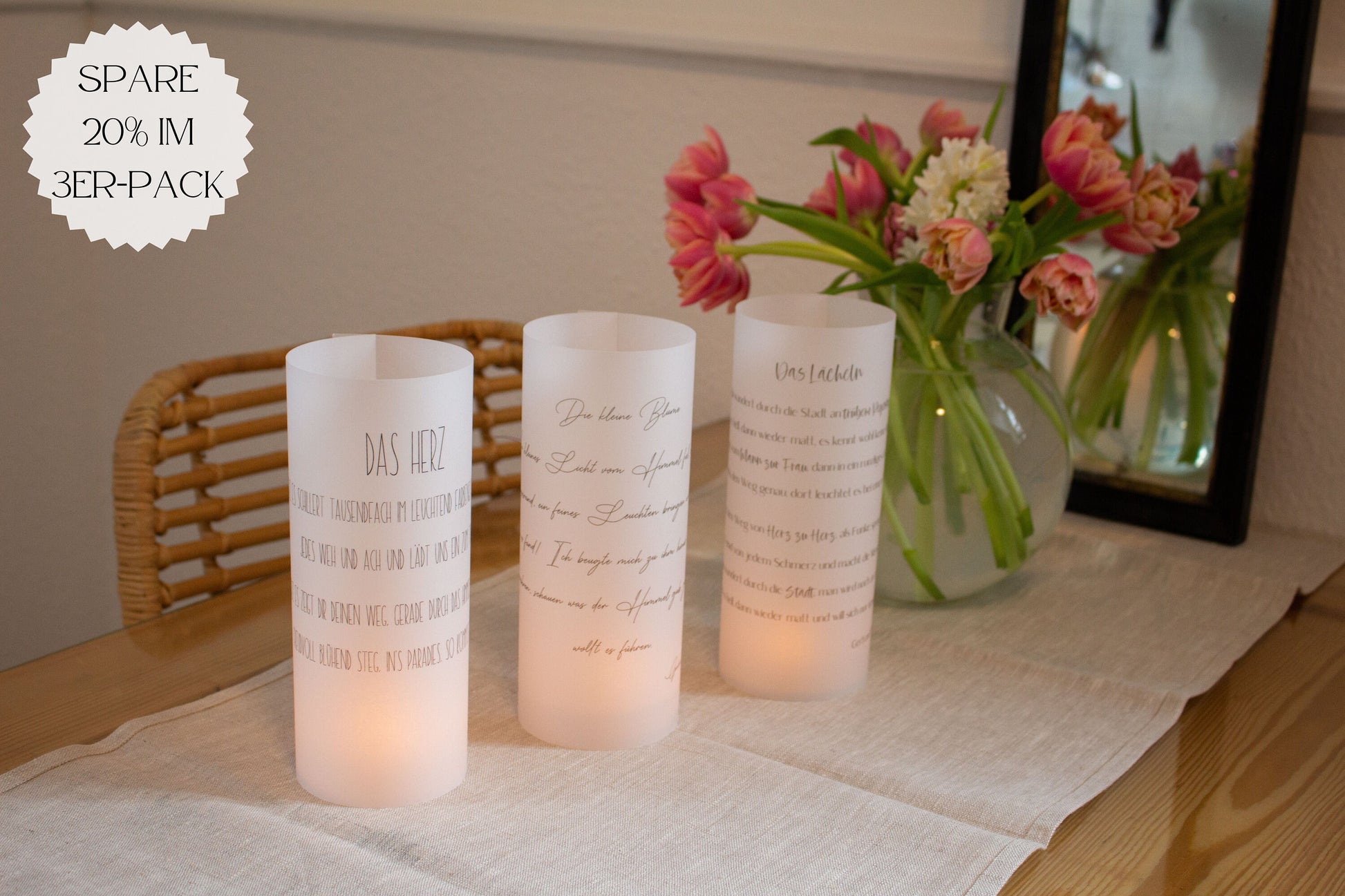 Unser Produkt "Licht Worte" ist ein besonders stilvolles Dekoobjekt. Die selbstgeschriebenen Gedichte sind in modernen Schriftarten auf 200 g/m2 Premium Transparentpapier (A4) gedruckt. Das hochwertige Papier verleiht dem Licht Stabilität und einen besonders edlen Look. Mit einer Kerze erzeugt das Licht eine gemütliche Atmosphäre. Im Paket enthalten sind der bedruckte Papierbogen, ein Bändchen zum Zusammenbinden und Teelichter, je nachdem wie viele du bestellst. Die Lichter können einzeln bestellt werden oder im 3er Pack. Auch super gut als Geschenk oder für Festtafeln geeignet. Tipp: im 3er Pack erhältst du drei verschiedene Gedichte und sparst gleich 20%! Achtung: Das Teelicht bitte nicht ohne Glasgefäß in das Licht stellen.