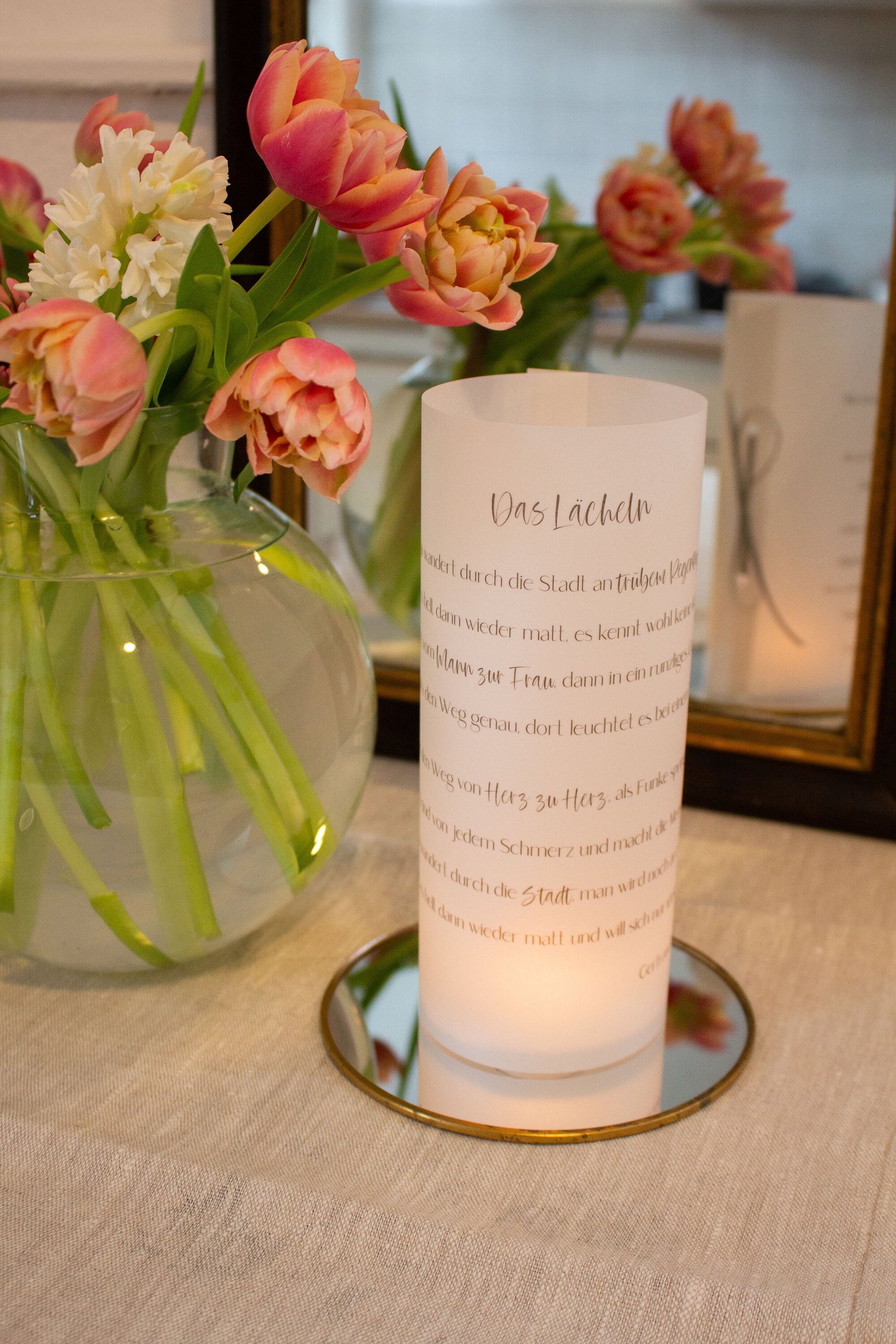 Unser Produkt "Licht Worte" ist ein besonders stilvolles Dekoobjekt. Die selbstgeschriebenen Gedichte sind in modernen Schriftarten auf 200 g/m2 Premium Transparentpapier (A4) gedruckt. Das hochwertige Papier verleiht dem Licht Stabilität und einen besonders edlen Look. Mit einer Kerze erzeugt das Licht eine gemütliche Atmosphäre. Im Paket enthalten sind der bedruckte Papierbogen, ein Bändchen zum Zusammenbinden und Teelichter, je nachdem wie viele du bestellst. Die Lichter können einzeln bestellt werden oder im 3er Pack. Auch super gut als Geschenk oder für Festtafeln geeignet. Tipp: im 3er Pack erhältst du drei verschiedene Gedichte und sparst gleich 20%! Achtung: Das Teelicht bitte nicht ohne Glasgefäß in das Licht stellen.