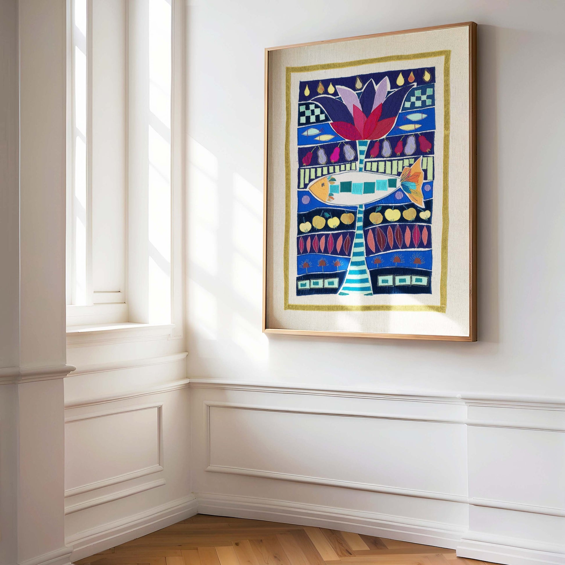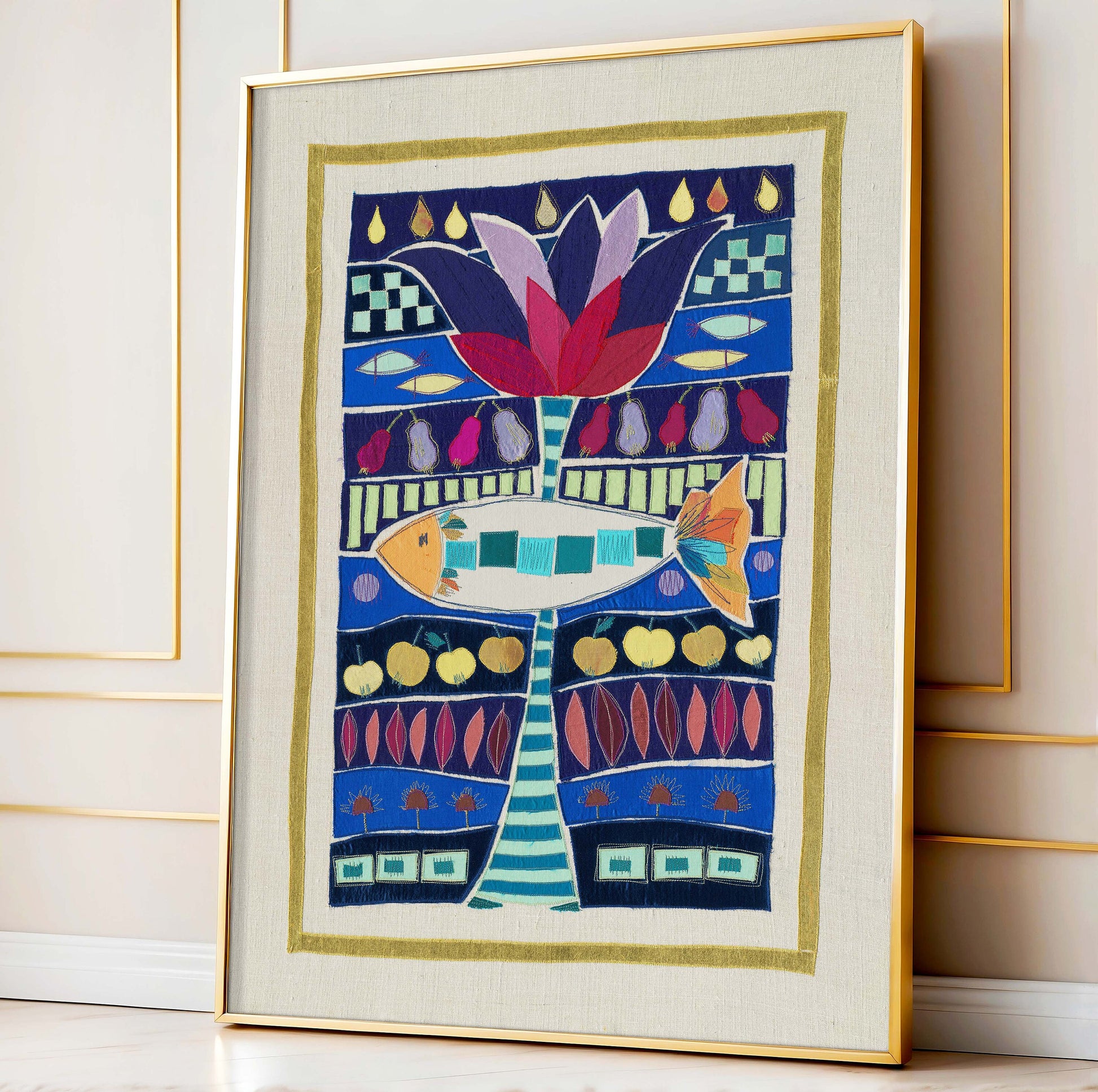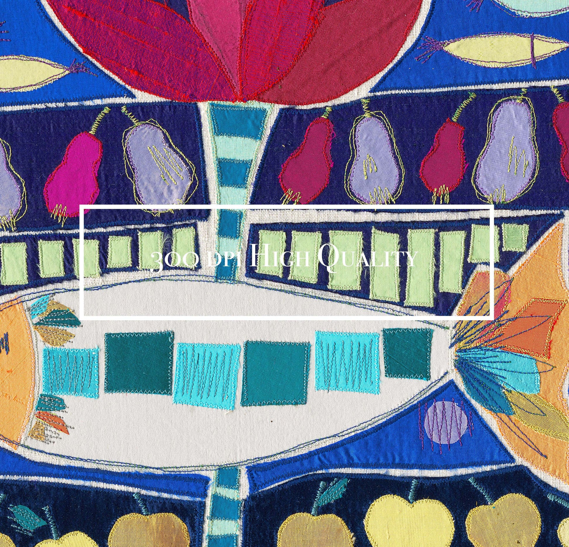 Dieser Kunstdruck basiert auf einem handgearbeiteten Stoffbild, das in aufwendiger Applikationstechnik entstanden ist (mehr dazu findest du unter "Unsere Geschichte"). Mit Hilfe eines speziellen Strukturscanners wurden die originalen Werke Digitalisiert. Durch eine hohe Auflösung bleiben selbst feine Nähte und die charakteristischen Stoffstrukturen im Druck sichtbar und die textile Tiefe des Originals bleibt auch auf Papier erfahrbar.