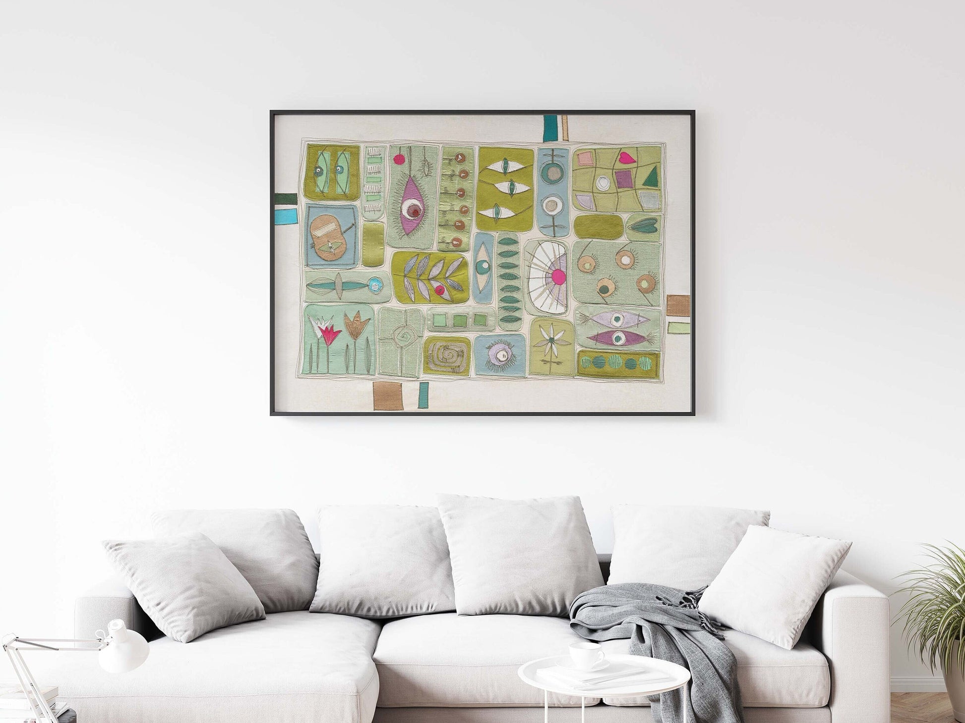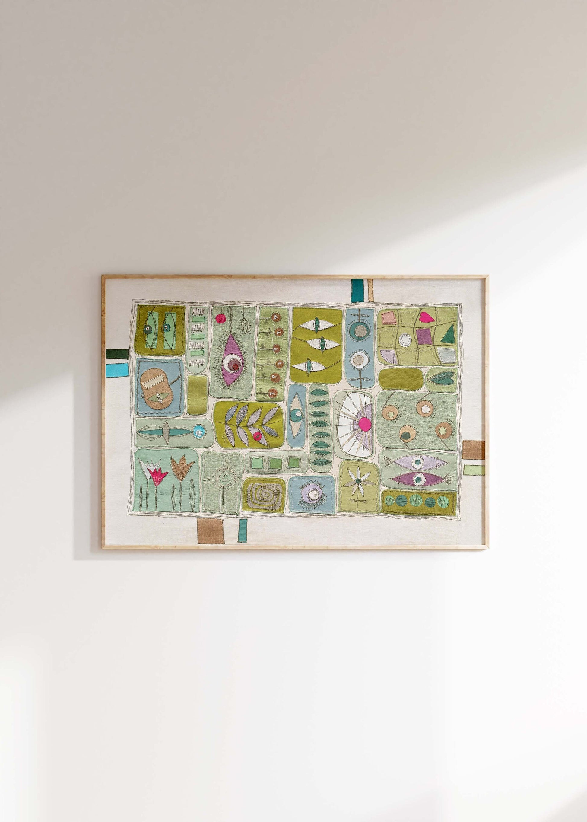 Dieser Kunstdruck basiert auf einem handgearbeiteten Stoffbild, das in aufwendiger Applikationstechnik entstanden ist (mehr dazu findest du unter "Unsere Geschichte"). Mit Hilfe eines speziellen Strukturscanners wurden die originalen Werke Digitalisiert. Durch eine hohe Auflösung bleiben selbst feine Nähte und die charakteristischen Stoffstrukturen im Druck sichtbar und die textile Tiefe des Originals bleibt auch auf Papier erfahrbar.
