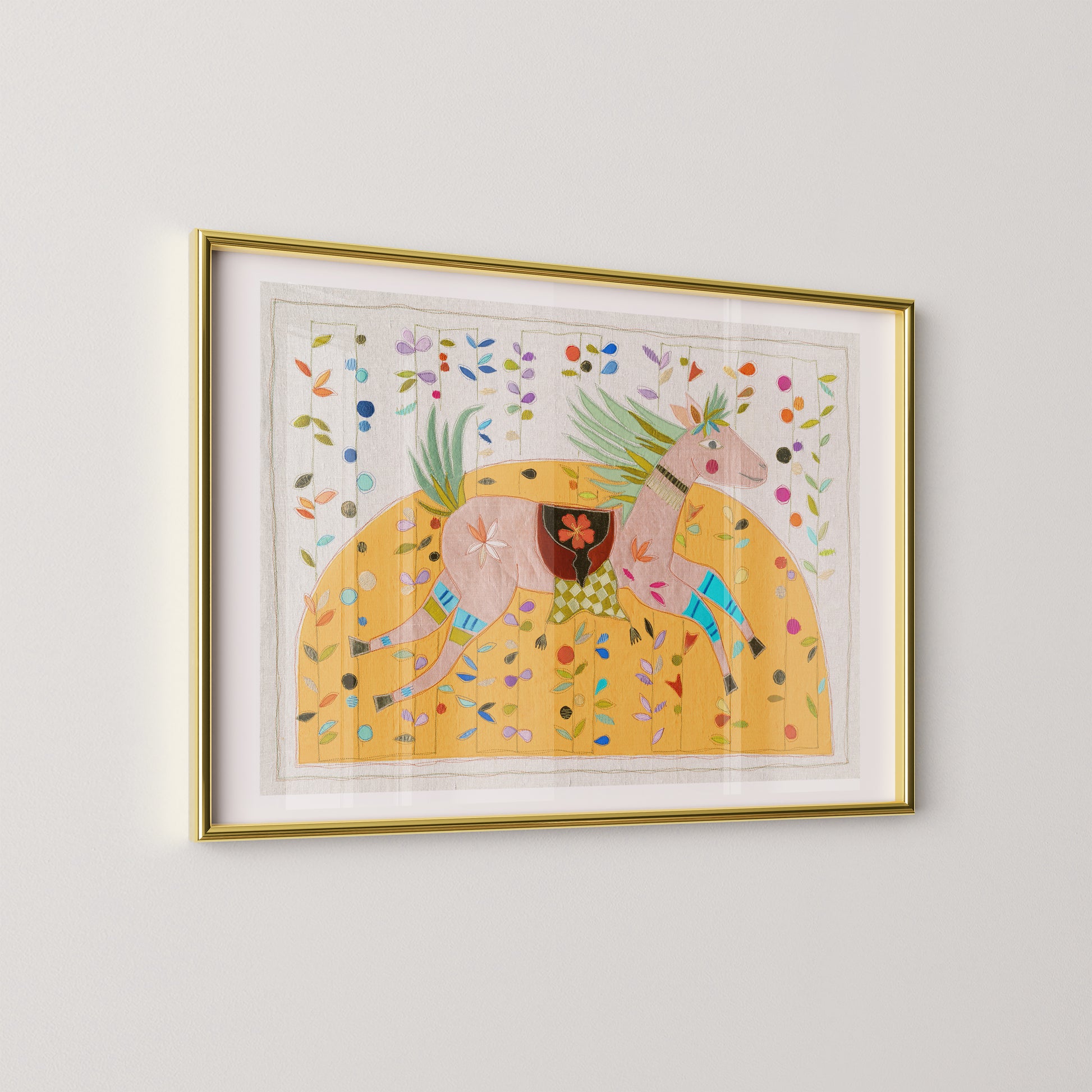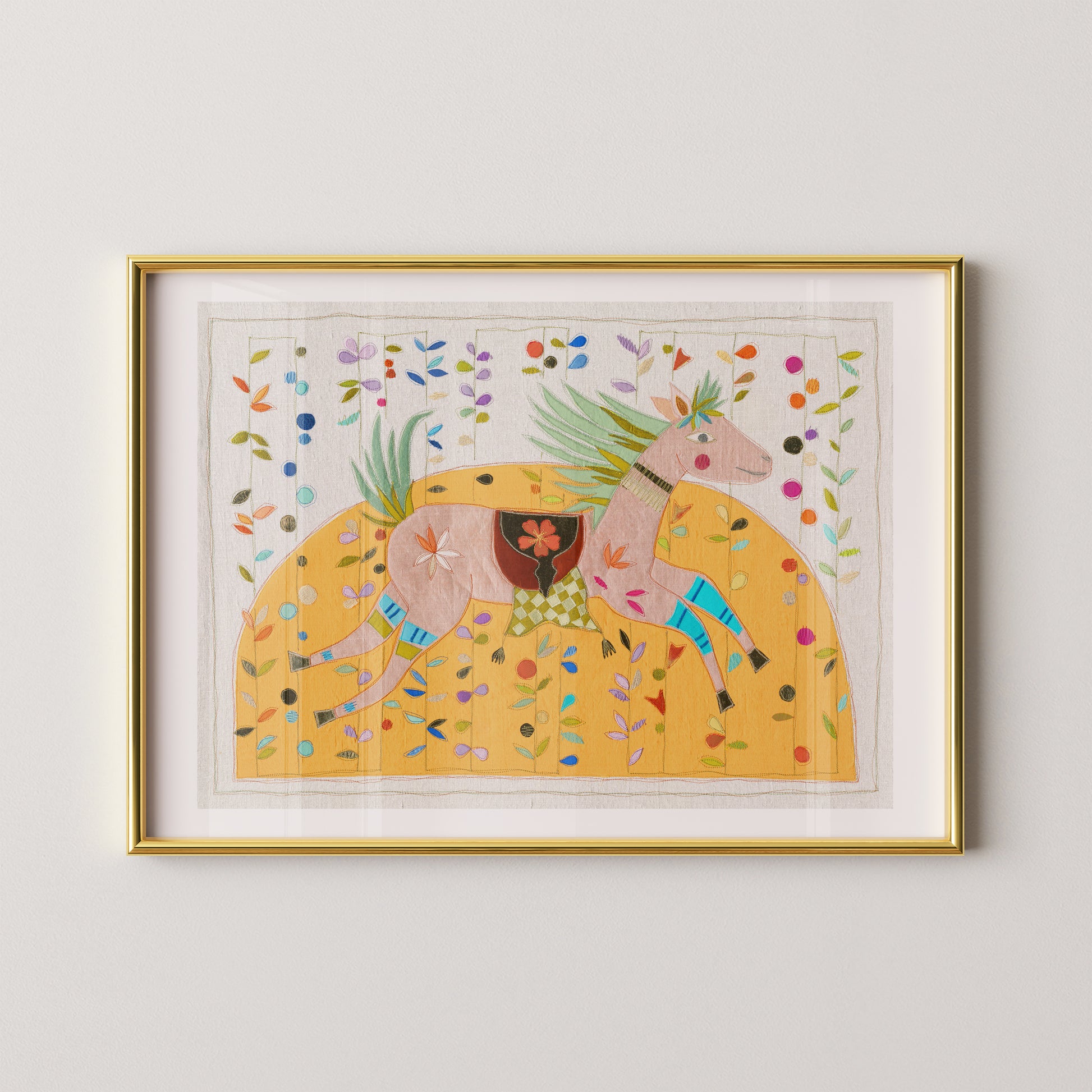 Dieser Kunstdruck basiert auf einem handgearbeiteten Stoffbild, das in aufwendiger Applikationstechnik entstanden ist (mehr dazu findest du unter "Unsere Geschichte"). Mit Hilfe eines speziellen Strukturscanners wurden die originalen Werke Digitalisiert. Durch eine hohe Auflösung bleiben selbst feine Nähte und die charakteristischen Stoffstrukturen im Druck sichtbar und die textile Tiefe des Originals bleibt auch auf Papier erfahrbar.